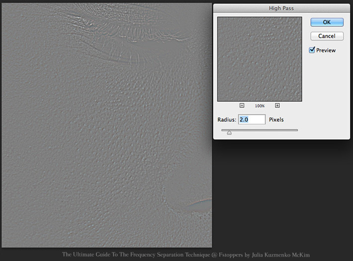 Es handelt sich dabei um eine sehr schnelle Methode und kann in manchen Fällen neben der Bildberechnung verwendet werden. Mit der Verwendung des Hochpassfilters haben Sie eine höhere Kontrolle darüber, welche Informationen zur HIGH-Ebene gehören und welche auf der LOW-Ebene weichgezeichnet werden sollten. Auf diese Weise sollte die weitere Retusche im Anschluss an die Frequenztrennung schneller und präziser durchgeführt werden können.