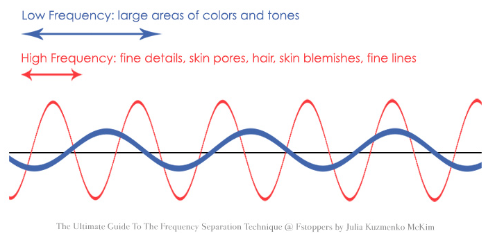 Die Technik der Frequenztrennung ist ein Prozess, bei dem bestimmte Bildinformationen „aufgespaltet“ werden, so dass sich Bilddetails in unterschiedlichen Bereichen unabhängig voneinander bearbeiten lassen. In jedem Bild gibt es unzählige Frequenzbereiche, die jeweils bestimmte Informationen (abhängig von der Größe der Details) enthalten. Üblicherweise werden die Bildinformationen in „Hoch- und Niederfrequenzbereiche“ aufgetrennt.