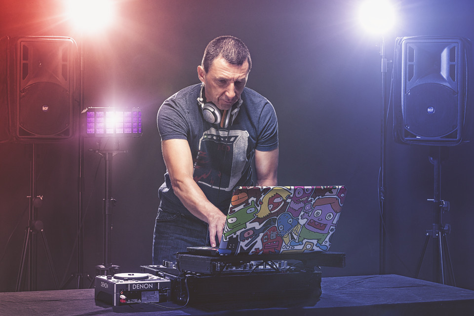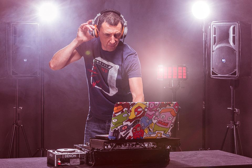 Im Studio bauten wir ein kleines „Club“-Set auf, um den DJ im passenden Licht erscheinen zu lassen und das ganze Szenario mit einer gehörigen Portion „Disco“-Feeling zu versehen. Wichtig waren in dem Zusammenhang vor allem die beiden Blitzköpfe im Hintergrund, die für die Lichtstimmung hauptverantwortlich sind.