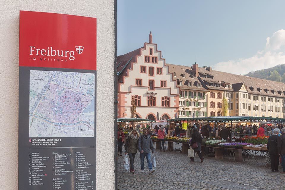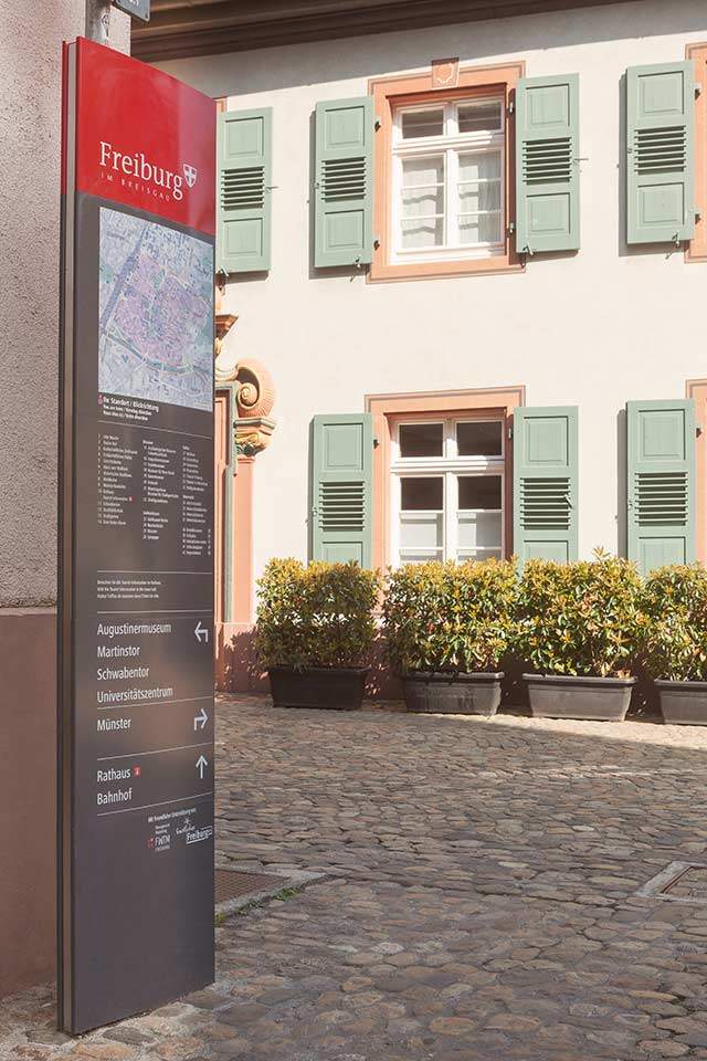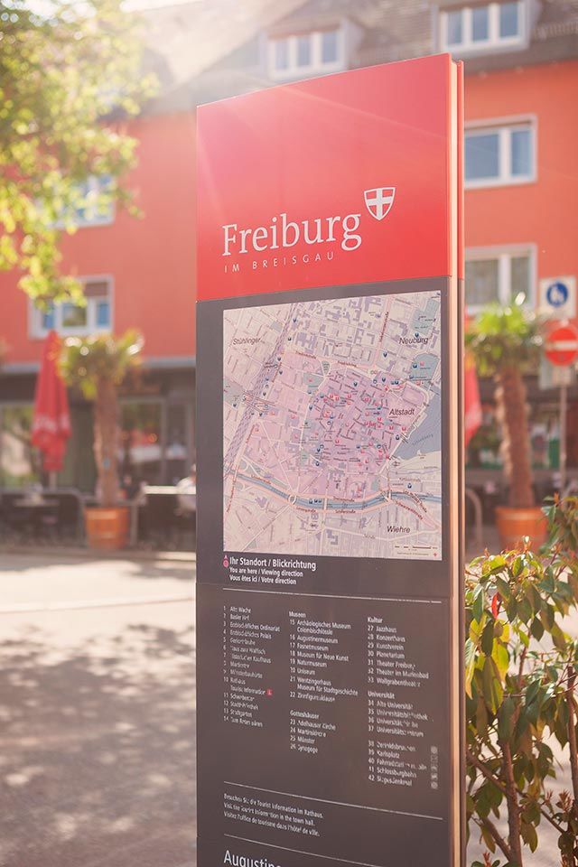 Wer kennt sie nicht – die Stelen des Fußgängerleitsystems in Freiburg. Das Unternehmen Geoplan aus Bayreuth ist in der Stadt-, Orts- und Regionalentwicklung tätig und entwarf unter anderem die Wegeführungen zu den wichtigen touristischen Zielen und Sehenswürdigkeiten in der Stadt. Meine Aufgabe war es, die Orientierungstafeln fotografisch zu dokumentieren.